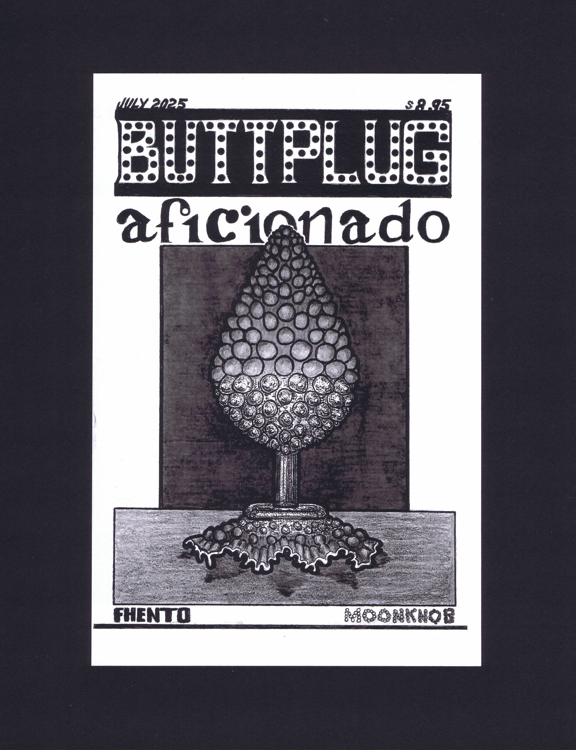 Interactive, multi-page print of 100% hand drawn original artwork. Black laser toner on 8.5x11" white paper. Print is front and back of two sheets of paper, folded and stapled vertically in landscape orientation. Content of BUTTPLUG AFICIONADO art print includes size guide, themed puzzles, a comic, and factiods. All aspects of the print are gender neutral. Resembles - to the untrained eye - a "magazine," but is not a "publication."