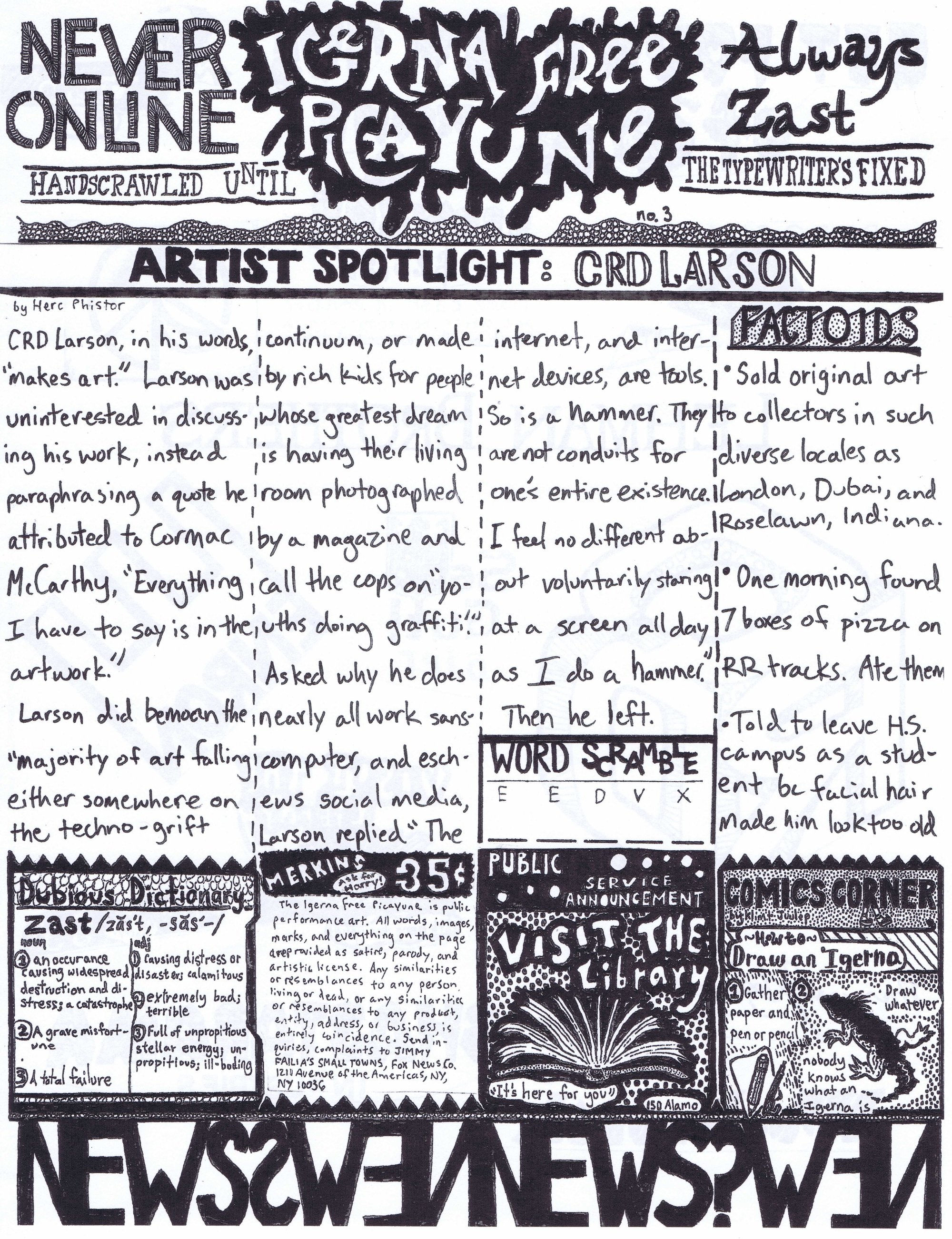 The most recent Igerna Free Picayune art print, laser toner on 8.5x11" white paper. A handmade collage expressing my reactions to the goings-on in the town of Weed, California and beyond. Reverse features faux sponsor "ads." To the untrained eye, this print may in some ways resemble a "newspaper" but the Igerna Free Picayune prints are artwork, not "publications." Image is a previous print to show product example, NOT the one (currently print #7) buyer will receive. NOTE: Free shipping option is print tri-folded in regular envelope with USPS First Class stamp. Free shipping option does not include tracking.